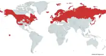 Fennoscandia South to the Pyrenees and from Ireland East through Northern, Central and Southern Europe (to South Italy) across the Palearctic into Russia and the Russian Far East and Sakhalin and Japan. In the Nearctic from Alaska to Nova Scotia and South to California. (see distribution map)[15][16][17]