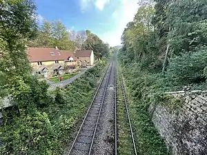 The Great Western Railway (GWR) line between Kemble and Gloucester – which had been planned by the Cheltenham and Great Western Union Railway – had opened on 12 May 1845, but no station was originally provided at Chalford: to the south-east was Tetbury Road, and to the west Brimscombe.[1] On 2 August 1897, a new station was opened at Chalford.[2]