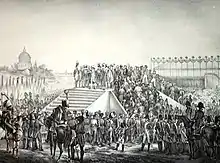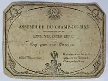 The assembly was planned to take place in May on the Champ de Mars, a stretch of open ground running from the military school at the École Militaire to the banks of the River Seine.[4] The site had a long association with public assemblies; new laws had been promulgated there since the time of the early French monarchs and, in 1790 during the Fête de la Fédération, Louis XVI had sworn to upload the post-revolutionary constitution.[5] The Champ de Mars also had a long association with Napoleon; a festival was held there in 1793 to celebrate the young Captain Bonaparte's victory at the Siege of Toulon and Napoleon had distributed imperial eagles, the standards of his regiments, to the troops there on the day after his coronation as emperor.[6] Napoleon announced the assembly on 30 April and the members of the electoral college (representatives of the arondissements and departments) were called to meet at Paris.[7] The ceremony was to have taken place in May, hence the name (Mai is French for May), but was delayed until 1 June.[8][9]