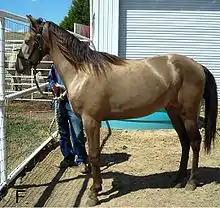 Amber champagne is produced by the action of champagne on a bay coat. The coat is gold with chocolate points. Just as there are varying shades of bay, the gold body coat may vary in shade as well.[6] The legs are often lighter than the mane and tail, and the colored points may be difficult to see. The mane and tail may also have "frosting" or light edges, a trait that also occurs in bay duns and some buckskins.[7] Amber champagne can be confused with buckskin or bay dun.