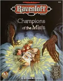 Champions of the Mists is a sourcebook which provides information on how the character classes interact with the Ravenloft setting, and the book provides new character class kits, and a number of non-player characters from books in TSR's fiction line, as well as past published adventures and editions of Ravenloft.[1] The book begins by briefly introduction the various classes of Champions of the Mists, covering the four core classes of warrior, wizard, cleric, and thief, but not the new classes from Domains of Dread or optional classes from the Player's Handbook.[1] The next section, "The Crucible", lists new character class kits for Ravenloft.[1]