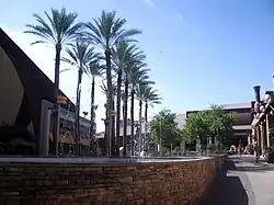 Adjacent to the food court entrance of the mall is an outdoor entertainment and dining plaza called The Village. The entertainment and dining options at The Village include the Harkins Theatres, Escape the Room, The Old Spaghetti Factory, and Buffalo Wild Wings. A popular attraction of the outdoor plaza used to be the Dancing Waters fountain featuring a display of water, lights and music. The fountains were later demolished in the Summer of 2014 and renovated into a picnic area that featured patio seating, lawn areas, and a children's splash pad. Surrounding the mall there are many large retail centers including Chandler Festival, Chandler Gateway, Chandler Village Center and the Boulevard Shops at Chandler Fashion Center, all of which Westcor used to own.