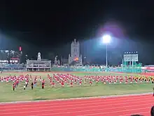 The stadium was renovated; its existing football ground including clearing and rearranging drains, rearranging the playing arena to accommodate new 6 lane synthetic track, dismantling and renovating the spectator steps as per necessity, turfing, new chain link fencing to the track, provision of structure for score board etc. for 35th National Games.[2][3][4][5]