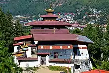 Changangkha Lhakhang is a compact temple complex located on the tip of a ridge that juts towards central Thimphu from the hills to the east. Founded in the 13th or 14th centuries, it is probably the oldest surviving temple in Thimphu. The main components and foundations of the monastery are extremely old, long predating the unification of Bhutan in the 17th century by Zhabdrung Ngawang Namgyal.[1] The temple is often frequented by parents with small children seeking to obtain blessings from the protective deity of the temple, Genyen Domtsangpa, who is considered to be the birth deity and protector of children born in JDWNRH national referral hospital in Thimphu.[2]