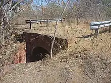 The Chapel Street Bridge was closed to traffic in the 1980s, due to National Trust interest in its preservation. Restoration estimates were given for reconstructing a damaged section, using salvaged fallen bricks.[105] Although closed, the bridge survives as a physical reminder that the mines at Sandy Creek, once accessed via the road that crossed the bridge, were important to Ravenswood's economy. In 2019, modern metal road guards block access to the bridge, which is located almost 300m north of the northern rim of Carpentaria Gold's Sarsfield pit.[106][1]