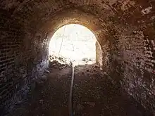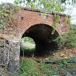 The recovery of Evlinton in the late 1890s led to the construction of the current brick bridge on Chapel Street, between 1895 and 1900. Due to the issue of water in the mines, large quantities of timber was required for close timbering in the shafts, which would also have increased business traffic into Evlinton. In addition, in late 1895 ore from the John Bull mines was dispatched to the Mabel Mill in Ravenswood for crushing.[66][67] In May 1895, the Ravenswood Divisional Board asked for a £500 grant to repair several roads and their bridges, including the road from Ravenswood to Evlinton. "These are all main roads and lead to thriving mining centres, particularly the Evlinton and Old [?] roads, where there are several large gold mines being developed.... All the roads and bridges thereon...are almost untrafficable, particularly in bad weather".[68] The expenditure statement of the Division of Ravenswood for the second half of 1895 refers to a £25 18s and 8p contract for a wall on "Slaughter-yard Gully", while the statement for the first half of 1896 lists a "retaining wall at Slaughter-yard Gully Bridge", for £25 18s and 9p, deducted from the "Main Roads Grant Account". Later, £48 is deducted, for a bridge, from the "John Bull and Standard Road Account" during the second half of 1900, suggesting that the Chapel Street Bridge was built in two stages, first the abutments, and then the brick arch.[69][70][71][1]