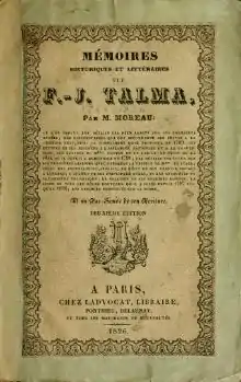 Mémoires historiques et littéraires about F.-J. Talma by C-F-J-B Moreau, 1827