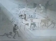 Self Portrait (1888) by Charles Altamont Doyle. In the original, he has written "That's his guardian angel over the left, utterly disgusted".[1]