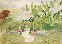 In 1876 he was dismissed from his job and given a pension;[7] in 1881 Doyle's family sent him to Blairerno House, a "home for Intemperate Gentlemen". After several escapades, in 1885 he was sectioned after managing to "procure drink", and becoming aggressively excited, remaining confused and incoherent for several days afterwards, and was sent to Sunnyside, Montrose Royal Lunatic Asylum. While there, his depression grew worse, and he began experiencing epileptic seizures and problems with short-term memory loss due to the effects of long term drinking,[8] although he continued to paint. He completed illustrations for the July 1888 edition of the first Sherlock Holmes novel A Study in Scarlet by his son.[9] During his period at the asylum he continued to work, producing volumes of drawings and watercolours in sketchbooks with fantasy themes such as elves, faerie folk, and scenes of death and heavenly redemption, with accompanying notes featuring wordplay and visual puns, described as a "sort of bucolic phantasmagoria: mammoth lilypads and leafy branches, giant birds and mammals, sinister blossoms sheltering demons and damsels alike".[10] Doyle created these illustrations to both protest his confinement and provide evidence of his sanity, sending the drawings to his family as proof that he had been wrongfully committed, writing "Keep steadily in view that this Book is ascribed wholly to the produce of a MADMAN. Whereabouts would you say was the deficiency of intellect? Or depraved taste?"[11] At other times he was more contented, contributing drawings and articles to the asylum's newsletter and sketching the staff.[8] On the 23rd of January 1892 he was admitted as a patient to the Royal Edinburgh Hospital, and remained there until the 26th of May 1892.[12]