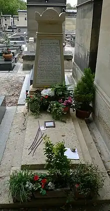 His financial difficulties increased again, however, particularly after his publisher Poulet Malassis went bankrupt in 1861. In 1864, he left Paris for Belgium, partly in the hope of selling the rights to his works and to give lectures.[30] His long-standing relationship with Jeanne Duval continued on-and-off, and he helped her to the end of his life. Baudelaire's relationships with actress Marie Daubrun and with courtesan Apollonie Sabatier, though the source of much inspiration, never produced any lasting satisfaction. He smoked opium, and in Brussels he began to drink to excess. Baudelaire suffered a massive stroke in 1866 and paralysis followed. After more than a year of aphasia, he received the last rites of the Catholic Church.[31] The last year of his life was spent in a semi-paralyzed state in various "maisons de santé" in Brussels and in Paris, where he died on 31 August 1867. Baudelaire is buried in the Cimetière du Montparnasse, Paris.