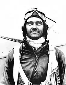 Upon learning in June 1941 about the formation of the American Volunteer Group under the command of Claire Chennault, Bond immediately volunteered and departed in September 1941 to serve in the Pacific.[8] After stops in Hawaii, Java, and Singapore, he arrived in Burma on November 12, 1941.[9] The unit, based in Burma and China, was tasked with protecting supply routes between China and Burma and with supplying Chinese forces fighting the Japanese.[5] The group was credited with shooting down 299 Japanese aircraft. It became known as the "Flying Tigers".[1] After seeing a picture of a Royal Air Force plane in North Africa, the group painted a shark mouth on the nose of their planes.[10] Bond was the first to paint his Curtiss P-40 Warhawk.[11] Bond was credited with shooting down nine and a half Japanese aircraft,[12] including three during a single 1942 mission. Bond was also shot down twice during his Flying Tigers service: in May 1942, he was shot down over Baoshan, China, and he parachuted into a cemetery after his plane and clothing caught fire. He was hospitalized, but returned to combat and was shot down again in June 1942; he suffered head injuries but returned to combat within a week.[5]