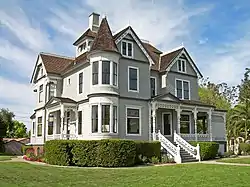 This house is a classic Queen Anne Victorian. Rising three stories over a raised basement, the twin gables, witches' hat turret, decorative shingles, trims and stained glass windows all contribute to the grand effect. The entry is distinguished by an ornate front porch. Inside the mansion are rich wood molding, stained glass windows and chandeliers. A unique chandelier is found in the old dining room. This brass fixture came from the family of the founder of the Bank of America, Amadeo Giannini. About 1975, Caroline and Vaughn Nixon bought the house and restored the ornate mansion to its original grandeur.