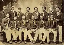 "Kamehameha Waltz" was penned by King as a paean to his alma mater and to Bernice Pauahi Bishop who created the trust fund that established the school, "Majestic stands Kamehameha/My home of education"..."For you, O great Pauahi, high chiefess/Our exclamations of joy".[11] The song was performed in 1914 by the King Glee Club as part of The Woods of Hawaii musical presentation at the Honolulu Opera House, sponsored by the Christian youth organization Young People's League.[12] It was first recorded on May 18, 1928 by the Charles E. King Male Chorus on the Columbia Records label.[13] Since then, it has become a standard at the school's annual song contest.