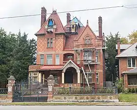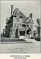 The Charles Frederick Myers house was built in an eclectic style, including elements of Romanesque Revival, neo-French provincial, and Queen Anne architecture.[1] It was among the most ornate houses built in the city in the 19th century,[2] built on Bryden Road (one of three streets in Columbus where the grandest houses were built, along with East Main and East Broad). It is one of the largest and most ornate houses on the street and in the Bryden Road District.[3] The architect is unknown, though is suspected to be a work of architect Joseph W. Yost or his firm Yost & Packard.[4][5] The home's design has numerous similarities to the Joseph Warren Yost House, situated on Bryden a few blocks to the west.[3]