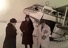 Charles Gossage Grey in Finland standing in front of an aircraft flanked by two Finnish government officials