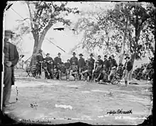 A photograph by Mathew Brady of General Ambrose Burnside and his staff—Loring is standing behind Burnside (seated with legs crossed) looking directly at the camera.