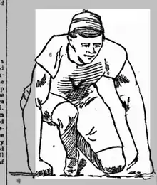 The Sport (Dublin) described his position as follows: "Sherrill gets down behind the mark, closes his hands tightly over his corks and rests his knuckles on or behind the scratch line. He rests on the ball of the right foot, with the left well down on the ground. When the pistol is fired he gives an upward jump or dive and gets into running very quickly. It is a question yet to be determined whether he gains anything by this new move."[9]