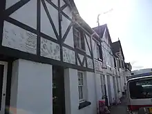 House walls in Drybridge Street, Monmouth, showing the wooden wallpaper blocks provided as decorative features by Crompton-Roberts