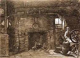 Many thoughts go through my mind as I look at Fiscus. First, the quality of his work is very high and thus his early death is an even greater tragedy. Second, in terms of style, he is a young artist experimenting to find his own particular voice. "Stone Cabin" is very close to the Realist style of the French artist Francois Millet. However, looking at his work overall, I see a blending of realism mixed with fantasy that suggests he must have been inspired by the English Pre-Raphaelites. Most especially, compare "A Dream of Elfand" and "Wide Awake" to work by Richard Dadd (whose best-known work is "The Fairy Feller's Masterstroke", c. 1864.)[28]