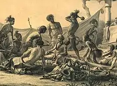 At least two finished pastel drawings survive from this period: a dramatic whaling scene, and the Assassination of Captain Marion du Fresne in New Zealand (by Maoris in 1772, at the Bay of Islands, killing 27 in total). Meryon knew the setting well, and the work was exhibited in the annual Paris Salon at the Louvre in 1848. In 1883 it was turned into an etching by Victor-Louis Focillon (father of the art historian Henri Focillon),[46] which was adapted as a book illustration. His drawing is now in the National Library of New Zealand, and remains the best known depiction of the incident.[47]