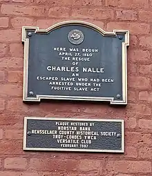 Helped by the Underground Railroad, Nalle settled in Troy, New York where he worked as a coachman and groom for the wife of a wealthy Rensselaer man, Uri Gilbert, in Troy at the time.[2] On April 27, 1860, Nalle was turned in to the local authorities. According to the Fugitive Slave Act of 1850, he was arrested and slated to be sent back to slavery in Virginia. As word got out, a large crowd gathered around the Mutual Building in Troy where he was being held.[2][3][4] Nalle managed to escape across the Hudson River to West Troy (modern-day Watervliet) during a clash between authorities and the crowd which included Harriet Tubman,[5] but the authorities were waiting for him on the other side and once again arrested him. Another clash occurred in West Troy, and during this time locals raised enough money for Nalle to be freed. His freedom was bought for 650 U.S dollars.[2][6]