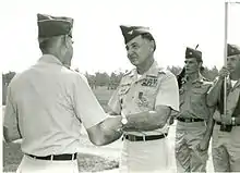 Murray was issued the Medal of Honor on August 1, 1945, eight months after the fight near Kaysersberg.[3] It was formally presented to him during a ceremony in Salzburg, with the entire 3rd Infantry Division in attendance.[2] He arrived home in Wilmington in September to a hero's welcome, but later returned to Europe and served four years of occupation duty.[1][2] During this time, he was stationed in Salzburg and became the head U.S. intelligence officer in that city.[2]