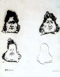 On trial on 14 November 1831, Philipon, sure to be condemned, defended himself arguing that everything can be made to look like the king, and that he and other caricaturists cannot be held responsible for this resemblance. He illustrated its defense by the metamorphosis by drawing, in four stages, the King's face evolving into a pear.[16] This imagery became a widely used reference and symbol of the revolution, even outside of Paris.[17]