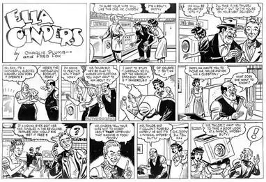 In the early 1920s, while Plumb was employed as an artist at the Los Angeles Times, he met screenwriter William Conselman, and the two created their Ella Cinders strip in 1925 for the Metropolitan Newspaper Service (later United Feature Syndicate). Initially, as the name implies, the strip presented a variation on the classic Cinderella story, but then it diverged into other plotlines, as noted by comics historian Don Markstein: