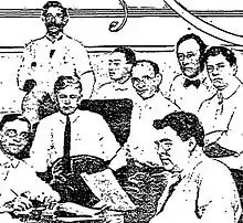 Assistant City Attorney Burnell in center, with glasses and looking at camera, surrounded by other lawyers who were working on a Silver Lake Park condemnation suit in 1913