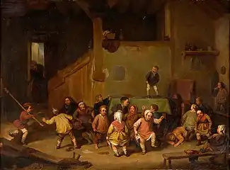 He moved to Antwerp in 1837, to work with his former teacher, De Braekeleer. While there, he came under the influence of the works of David Teniers and Adriaen van Ostade; particularly those that depicted villagers and peasants having fun. The resulting works are nostalgic in nature: pleasant, and reminiscent of similar works from the 17th century. A story line is always implied.