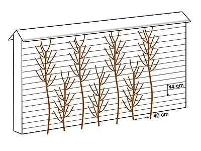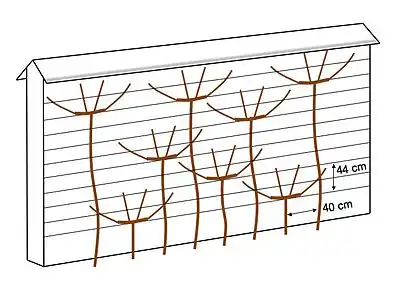 Vines are propagated mainly by simple or basket layering, as well as by cuttings during the March-April period. In the 1850s-1900s, seedlings were also used. Grafting was sometimes used.[26] Vine pruning, essential to the quality of Thomery Chasselas, began in February and was carried out with two eyes (including the heel eye), preserving only the strongest shoots, which were led over the wires running along the walls.[27] Since the beginning of the nineteenth century,[28] trellises at Thomery have been trained using five techniques, all designed to ensure rapid ripening of the wood and the most even possible distribution of sap throughout the plant:[7]