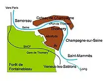 The special climatic features of Thomery are due to its location, entirely in a meander of the Seine, and to its position at the eastern edge of the Fontainebleau forest, which shelters it from storms. The vineyard is also protected to the north and east by the Champagne-sur-Seine hillside and forest.[1] The morning fog generated by the Seine at the end of September and the beginning of October also favors the final ripening phase of the grapes and their golden color.[9]