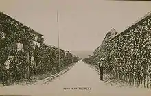 In 1900, 12 tons of grapes out of the 700 tons produced that year were sold for export. In 1912, under the impetus of Georges-François Charmeux, a railway advertising executive and descendant of the first of the name, the Compagnie du chemin de fer de Paris à Orléans decided to implement a genuine policy of popularizing cultivation techniques and promoting Chasselas.[6] Chasselas cultivation in Thomery reached its peak, with annual production of 800 tonnes on some 150 hectares and 250 km of walls.[5] Noting the commercial success, the neighboring communes of Veneux-les-Sablons, Moret-sur-Loing, Champagne-sur-Seine (selling its grapes under the clever name of "Champagne grapes") and even Samoreau also decided to develop Chasselas cultivation.[11]