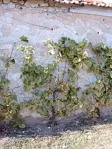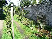 The main distinctive feature of Chasselas cultivation in Thomery, a relatively northerly region for vines, is the use of high espalier walls built from hard stone quarried nearby, held together with earth mortar, and plastered with sand and lime.[8] Initially 2.20 to 2.30 meters high, they were raised around 1850 to an average of 3 meters to maximize production surface area.[8] They are spaced at an average of 9 to 10 meters apart, and are arranged along the slope so as to give the vines the maximum benefit from the sunshine and heat given off by the stone in the evening and at night, and to protect them from the wind. The longest walls could reach 100 meters.[5] At the top of the roof-tile ridge, which protrudes 25 cm, is a small glass canopy which, through a greenhouse effect, increases the amount of sunshine and protects the grapes from the rain.[5][8] The vines are planted only in front of the south-facing walls, spaced 60 to 70 centimeters apart and growing mainly horizontally. Counter-trellises about one meter high are erected one meter from the walls in order to grow other alternative vegetable crops such as apples or pears in the traditional way.[8]