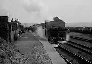 Passenger services were withdrawn in June 1963, though the closure of the service was not directly due to the Beeching Axe (withdrawal had already been proposed prior to the publication of his report in March of that year). Local sand traffic from nearby quarries continued and a new road-rail loading dock replaced the goods shed in the late 1960s.[1] Approximately 1,200 tons per day was being moved by this time but in the 1970s the amount of traffic reduced and on 6 March 1978 public freight working was withdrawn. A small amount of traffic for railway civil engineering use continued until November 3, 1984.[2]