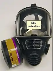 If a cartridge has a device to warn the user of the approaching expiration of the service life (end-of-service-life indicator, ESLI), the indication can be used for timely replacement of cartridges. ESLI can be active[47] or passive.[48] A passive indicator often uses a sensor that changes color. This element is installed in the cartridge at some distance from the filtered air outlet so that the color change occurs before harmful gases begin to pass through the cartridge. An active indicator may use a light or an audible alarm to signal that a cartridge needs to be replaced.