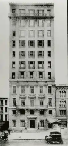 The Chemists' building at 52 East 41st Street, New York City, New York, United States was built by the architects York and Sawyer, replacing previous numbers 50-54. York and Sawyer filed the plans in January 1910[2] and completed the work in March 1911. The building opened on March 17, 1911.[1]: 6–7 Several days of events were held to celebrate the opening. A number of scientific papers were presented, ranging from "The characteristics of living matter from the physico-chemical point of view" by Jacques Loeb to "The chemistry of phosphorescence" by Wilder Dwight Bancroft and "The contributions of chemistry to sanitation" by William P. Mason.[7]: 20
