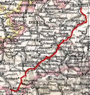 The Chemnitz–Adorf railway is a branch line in Saxony, Germany that was built and operated by the Chemnitz-Aue-Adorfer Eisenbahn-Gesellschaft (CAAE). The 115 km long line originally ran from Chemnitz in a southwesterly direction along the valley of the River Zwönitz to Aue. From Aue the line ran along the Zwickauer Mulde to Muldenberg and up to Schöneck and through Markneukirchen to Adorf in Vogtland.