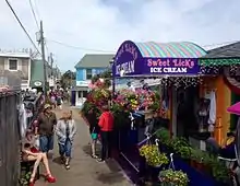 • The central business district, or Town, from Holly Walk to Doctor's Walk, and the beach to the bay, includes the Fire House, Community Center/Arts Project, The Ice Palace Resort, a clinic, and the public ferry dock, as well as a few cooperatives, bars, grocery stores, art galleries, realtors, and restaurants. It is more densely settled than the rest of the hamlet. Several major structures in the center were "destroyed" by a large fire in March 2015, including the Grove Hotel (since rebuilt) and Holly House.[15]