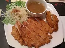 Chicken katsu (chicken cutlet (Japanese: チキンカツ, Hepburn: chikinkatsu)), also known as panko chicken, or tori katsu (torikatsu (鶏カツ)) is a Japanese dish of fried chicken made with panko bread crumbs. It is related to tonkatsu, fried pork cutlets. The dish has spread internationally and has become a common dish served at Japanese and East Asian restaurants worldwide.[1][2]