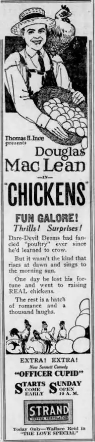 Chickens is a 1921 American silent comedy drama film directed by Jack Nelson and written by Agnes Christine Johnston based on the story "Yanconna Yillies" by Herschel S. Hall. The film stars Douglas MacLean, Gladys George, Claire McDowell, Charles Hill Mailes, Raymond Cannon, and Willis Marks. The film was released on February 13, 1921, by Paramount Pictures.[1][2] It is not known whether the film currently survives.[2]