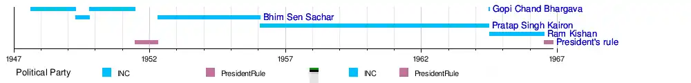 The state of East Punjab was formed in 1947 later it was renamed Punjab in 1950. It consisted of the parts of the Punjab Province of British India that went to India following the partition of India. Since 1947, Punjab has had fifteen chief ministers. The first was Gopi Chand Bhargava of the Indian National Congress party, who was sworn in on 15 August 1947, when India gained independence from the British. He was succeeded by fellow Congressman Bhim Sen Sachar, who was then subsequently replaced after 188 days by former Chief Minister Gopi Chand Bhargava. After a brief term, President Rajendra Prasad placed the Punjab Legislative Assembly under suspension for ninth months to help the state government gets its act together. In 1952, the first state elections took place for the Legislative Assembly. The results of the election saw the return of the Congress government with former Chief Minister Bhim Sen Sachar as its leader. After he resigned in 1956, Partap Singh Kairon became chief minister. Serving until 1964, Kairon remains one of Punjab's longest-serving chief ministers. He was followed by the returning Chief Minister Gopi Chand Bhargava, who briefly held office as acting chief minister for only 15 days. In July 1964, Ram Kishan assumed the office and served for two years. His tenure was followed by the President's rule which lasted for 119 days. On 1 November 1966, the state of Haryana was partitioned from Punjab and some other districts were given to the state of Himachal Pradesh.
