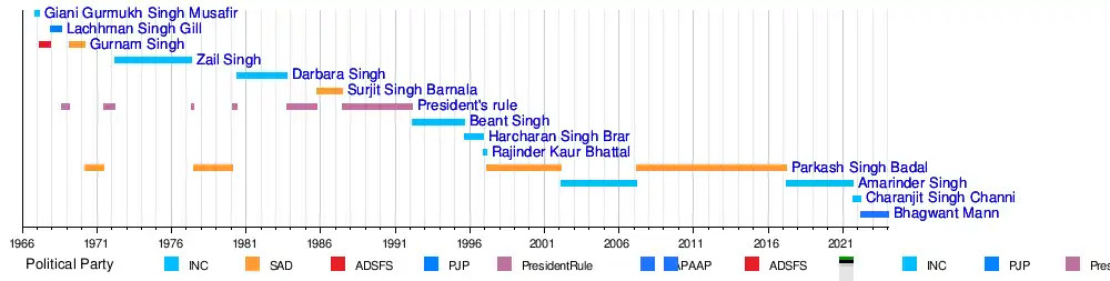 The first chief minister of the newly re-configured state was Giani Gurmukh Singh Musafir who led a Congress government from the Vidhan Parishad, one of only two to have done so. In the 1967 elections, he was voted out of power in favour of the Akali Das Sant Fateh Singh Group whose leader Gurnam Singh became the first non-Congress chief minister. Gurnam Singh's government was succeeded by three short-lived Akali Dal governments—Lachhman Singh Gill's government for less than a year and a little more than a year under the returning Gurnam Singh and Parkash Singh Badal. After 272 days under President's rule, the Congress party returned to power under the future President Zail Singh. In 1977, Parkash Singh Badal became the chief minister for the second time. Darbara Singh became chief minister in 1980 and remained in office for three years before a long period under President's rule. A brief interlude under Surjit Singh Barnala followed, after which three Congress-led governments took office—led by Beant Singh from 1992 to 1995, Harcharan Singh Brar from 1995 to 1996 and Rajinder Kaur Bhattal from 1996 to 1997. Upon taking office, Rajinder Kaur Bhattal became the first female chief minister of Punjab and overall the 8th female chief minister in India.