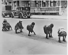 Although children's street activity varies from place to place, research shows that it appears to share many commonalities across many cultures.[3] As a traditional phenomenon it has been closely investigated and documented in the western world during the 20th century by anthropologists and folklorists such as Iona Opie; street photographers such as Roger Mayne, Helen Levitt, David Trainer, Humphrey Spender[4] and Robert Doisneau; urbanists such as Colin Ward and Robin Moore, as well as being described in countless novels of childhood. The research of Robin Moore stresses children's need for "marginal" unsupervised areas "within running distance" of homes (scrubby bushes and hedges, disused buildings). Two academic journals emerged to discuss this area, the Journal of Children's Geographies and Play & Folklore.