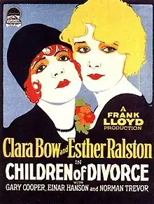 Children of Divorce is a 1927 American silent romantic drama film directed by Frank Lloyd and starring Clara Bow, Esther Ralston, and Gary Cooper. Adapted from the 1927 novel of the same name by Owen Johnson, and written by Louis D. Lighton, Hope Loring, Alfred Hustwick, and Adela Rogers St. Johns, the film is about a young flapper who tricks her wealthy friend into marrying her during a night of drunken revelry. Even though she knows that he is in love with another woman, she refuses to grant him a divorce and repeat the mistake of her divorced parents. Produced by Jesse L. Lasky, E. Lloyd Sheldon, and Adolph Zukor for the Famous Players–Lasky, the film was released on April 25, 1927 by Paramount Pictures.[1]