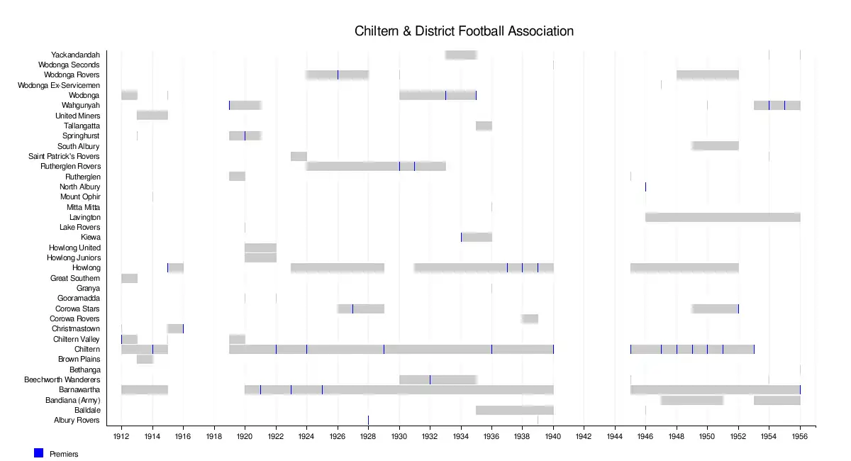 - Chiltern: 1912 to 1915, 1919 to 1940, 1945 to 1953. Joined the Ovens & King Football League in 1954.
