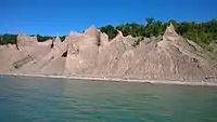 The bluffs are formed from eroded drumlins, teardrop-shaped hills of glacial till that were deposited and shaped by glaciers during the most recent ice age. The erosive power of wind, rain, snow, and waves has formed the landscape into sharp pinnacles.[5] Although the pinnacles and cliffs, some of which rise up to 150 feet (46 m) above the lake shore,[6] have existed for thousands of years, they are constantly changing and further eroding.[5]