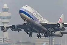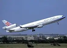 On February 8, 1990, China Airlines received the first of its initial five Boeing 747-400s (B-161).[9] 1993 saw the airline listed on the Taiwan Stock Exchange. The new 747-400s and an earlier order with Airbus for over a dozen A300B4 and A300-600Rs wide body regional jets allowed for addition destination growth. During the 1990s, China Airlines also bought the McDonnell Douglas MD-11 and had to compete with a new competitor, EVA Air. They also founded another airline to deal with the PRC-ROC dispute which borrowed aircraft from China Airlines itself.[10] One of China Airlines's 747-400s (B-164) was also used by President Lee Tung-hui during his trip to the United States in June 1995.[11]
