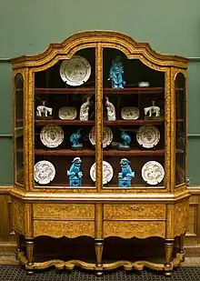 The china cabinet already existed by the late 17th century, initially used for Japanese export porcelain and its Chinese equivalent, then very fashionable, especially in England and the Netherlands. William and Mary's reign particularly popularized the furniture and porcelain, as Queen Mary was known for collecting Chinese pottery. At this date European porcelain had not been developed.[3]
