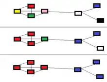 An example of how Chinese whispers works in action. The different colors represent different classes. (top) Initial cluster assignment. (middle) The graph after the first step 2, in which (in order) the pink, green, yellow, red, black, white, and blue nodes were selected. (bottom) The graph after a second step 2, in which the green and white nodes were selected, with the order of the remaining nodes after that not important. This clustering is stable because each node is colored the same as the plurality of its neighbors.